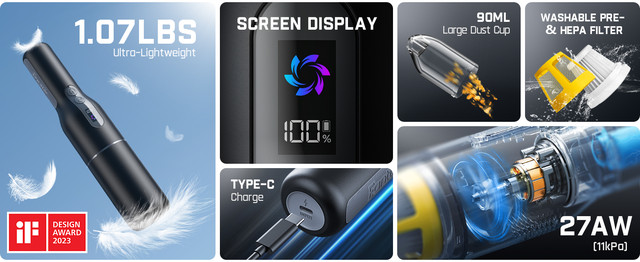 Светодиодный дисплей и широкая совместимость. Светодиодный интеллектуальный дисплей показывает оставшуюся мощность, режимы всасывания и напоминание о сбрасывании пыли, что дает вам интерактивный опыт. А благодаря зарядному порту USB-C этот беспроводной автомобильный пылесос может использовать зарядное устройство совместно с мобильным телефоном, что позволяет полностью заряжать его в дороге (в машине, самолете, путешествии/кемпинге) в любое время.